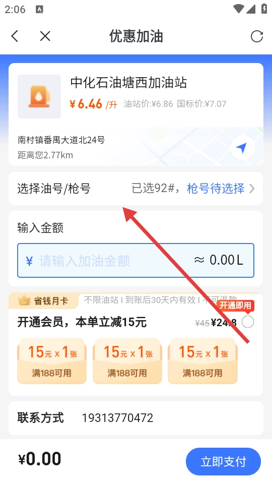 4、进入加油站详情页面后,挑选油号/枪号,输入加油金额,接着完成支付,从而下单加油。
