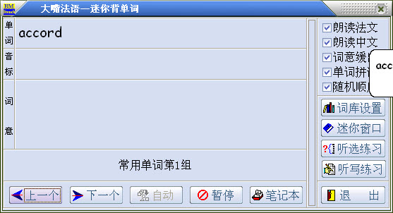 即跟读功能。通过与标准法语的对比,可以纠正自己的发音错误,检查重音和语调是否正确。反复大声地说,反复地对比,一直到能够脱口而出标准的法语,这是疯狂英语的精神,也是解决“哑巴法语”的很好的途径。