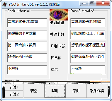 游戏王卡组上手率计算器只是一个先行测试版,以后的功能会慢慢完善,当然了对于我这个初三党来说时间紧迫,但我会尽我最大的努力更新功能的。
