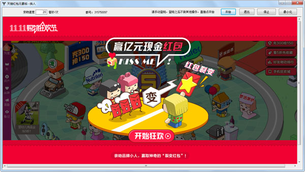 2013年双十一购物节要来了,天猫推出了光棍节裂变红包领取,天猫红包元素版是2013双十一自动抢天猫红包的辅助工具,使用方法很简单,登录旺旺后,先点击开始狂欢,再点软件上的开始即可。