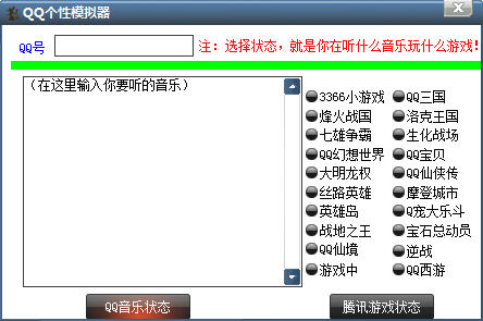 qq状态模拟器是一款修改qq状态的模拟工具,可以修改多种应用的显示状态,包括QQ音乐、qq仙境、逆战等等游戏时的状态显示,帮助您更好地彰显自己的个性