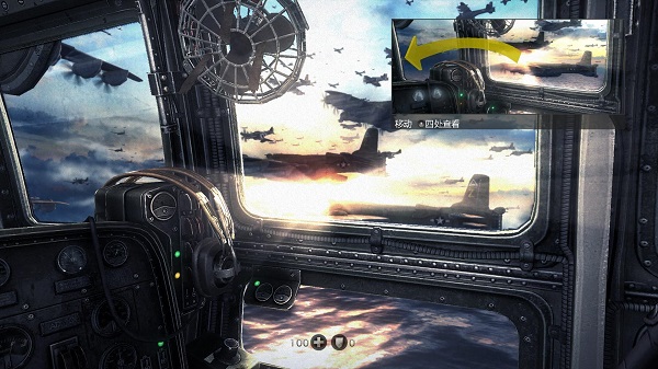 去到驾驶舱,在两驾驶座中间的通道,按X键可以进入到机关炮舱内,对着空中的敌方战机进行射击。