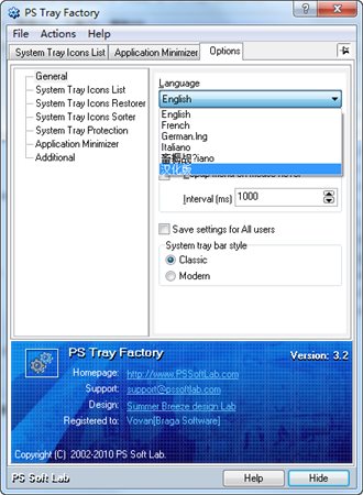 PS托盘工厂是一个强大而灵活方便的工具旨在控制其他所有图标在任务栏的系统托盘。PS托盘工厂将帮助您管理的所有应用程序把他们的图标在任务栏上托盘。当你已经安装了PS托盘工厂,你会忘记这个问题缺乏空间在系统托盘中,也将得到一个简单、快速和方便的工具来处理那些应用程序。简而言之,所有的Windows用户将得到这个方便的和强大的工具可供选择,而只有Windows XP用户有一个想法。对于后者,我们已经有了一个美好的惊喜,因为功能PS的托盘工厂超过标准的内置函数的操作系统。与PS托盘工厂可以快速隐藏系统托盘图标和容易管理它们。
