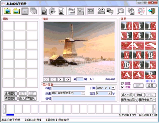 家家乐电子相册制作可以管理图片、相片,有150种图片切换显示方式,并生成完整的电子相册或vcd、svcd、dvd格式的视频文件,方便刻录到光盘。在光盘中即可直接播放。系统中,对每相册中,可以设定多达500个主题,每个主题中可以设定单独的背景音乐文件(最多可达50首),设定每个主题的封面图片。对每幅图片,可设定图片的标题,拍摄日期、显示方式、图片的延迟及其他有关说明。