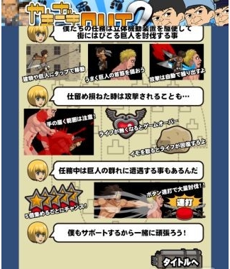 在进击的巨人机动装置安卓版游戏中,每杀死一个巨人,得到1颗星星,收集齐5颗,则可以变身为巨人也就是无敌模式。而每被巨人拍到则减一颗红心。这游戏首屏常年有两行广告,离线则变成白条。但是游戏过程中不会有广告,喜欢进击的巨人的玩家可以试试哦。