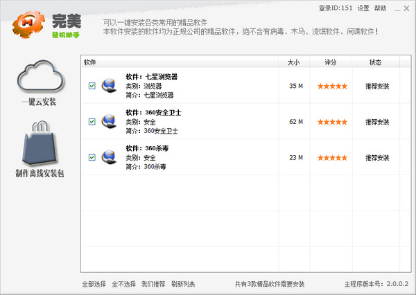一键云安装各种精品软件无需人工下载,一键云安装可以快速智能下载并安装软件。制作离线安装制作离线安装包可以快速安装多台机器,可以制作成为随身携带的光盘或优盘,一次制作随意安装。软件升级智能提醒:精品软件升级更新,第一时间通知用户。