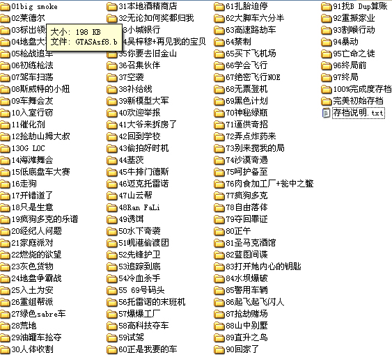 重命名存档:圣安地列斯主线任务有大概99个主线任务,有些用户为了方便下载者识别哪个存档对应哪个任务,会将自己的存档文件重命名加上该存档对应的任务名,如GTASAsf13抢夺山姆大叔.b。但是这样形式的存档游戏是无法识别的