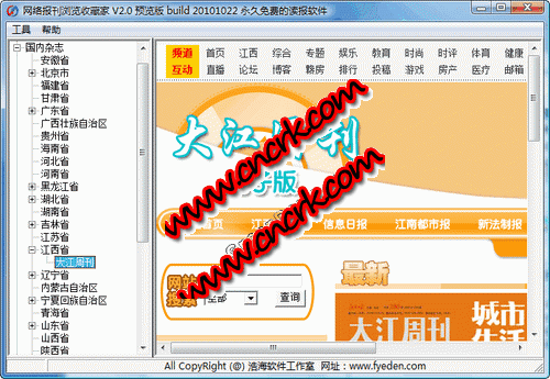 网络报刊浏览收藏家是目前国内功能最强的新闻 阅读器。可以阅读国内外千余种报刊杂志、新闻网站、电视广播,内置可分类新 闻频道。软件界面简洁、操作简便,既可在内置浏览器中浏览新闻,也可在系统 默认的浏览器中浏览新闻