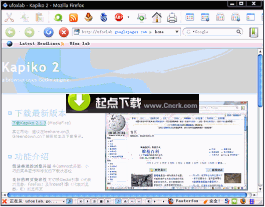 Kapiko(原Convenientfox) V3.0.12 简体中文绿色免费版 Kapiko是一款基于Firefox的浏览器,它基于Firefox 3.0.3(Gecko 1.9.0.3),集成了大量实用扩展,普通电脑用户绝对值得试试。Kapiko具备良好的网页兼容性,支持自由切换浏览器内核;用户可以在浏览器中控制音乐播放;内置代理工具,网络冲浪无忧;强劲广告过滤,让你彻底告别各种广告;贴心的智能网址纠错;支持标签页缩略图预览;内置FTP管理器、支持多线程下载……