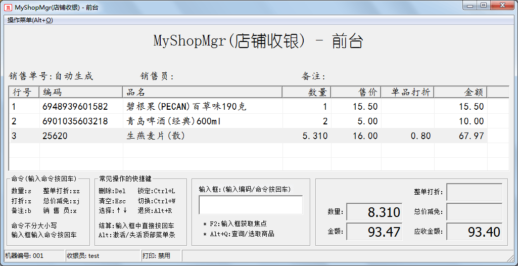 2. 命令:修改商品数量:s;单品打折:z;备注:b;整单打折:zz;总价减免:zj;输入销售员:x。(输入框中输入命令按回车,大小写不敏感)