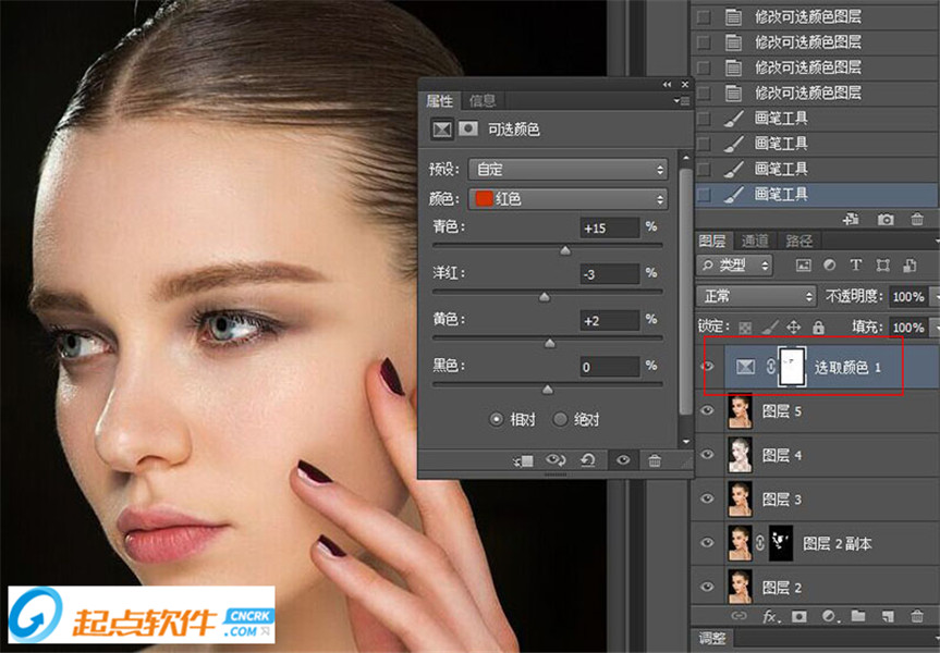 最后,我发现肤色有些偏红,新建了“可选颜色”图层蒙版,微调肤色。在此,可以选择黑色画笔,擦除不需要调色的部分。到这里,整个磨皮过程就结束了。