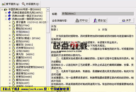 收录中、西药物及中药方剂共六千五百种,按照科目进行分类,可快速定位药物, 还可全文检索。可以查询常用的药物作用、剂量及副作用,种类较少,属于普及型非专业药物手册。是医务工作者必备的电子读物.