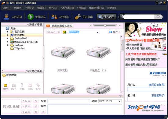 搜拍图片管理专家是集图片的本地磁盘管理、上传、下载并建立个人网络图片空间的图片综合类软件,用户可以利用悍小的客户端软件将本地图片快速地上传到个人网络图片空间,每张上传的图片均有独立的URL地址,可以使您与亲友即时分享精彩美图的同时也方便了您的网络贴图,购物等活动。