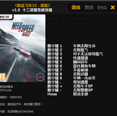 极品飞车18修改器是一款同名游戏的辅助修改工具,共添加十二项修改选项,功能十分齐全,帮助玩家体验更加极速的赛车乐趣。