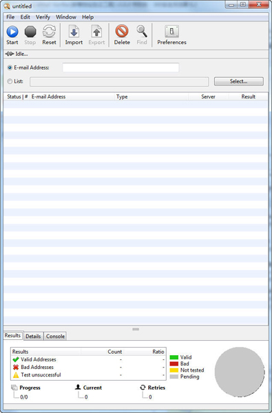 支持.TXT,.HTML, .ADR, .LST, .CSV等多种邮件列表导入方式,执行速度快,每小时可以验证1,000,000个邮件地址,支持单独保存正确的Email地址或者单独保存错误的Email地址,程序支持直接删除重复的邮件地址,快速邮件地址导出功能,5分钟可以导出1,000,000个Email地址!功能非常强大!【使用方法】