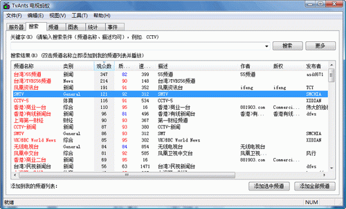 TvAnts(电视蚂蚁) V1.0.0.59 Build0835 简体中文绿色免费版 TVants是一种全新的流媒体播放软件,她的核心技术类似于现在非常流行的BT(BitTorrent), 即一个播放节点同时和数个播放节点交换(提供或索取)数据,使得带宽的占用达到最大化,获得 最佳的播放效果。 该软件的使用和BT下载很相似,当一开始使用的时候,速度不会很快,但是经过10分钟左右 的节点数据交换后,播放的效果会有很大改观,变得非常流畅。目前该软件正处在测试期间,不是特别稳定,但是如果这项技术真正得以完美实现,这将是 一个突破性的技术,也将会使网络电视大规模普及