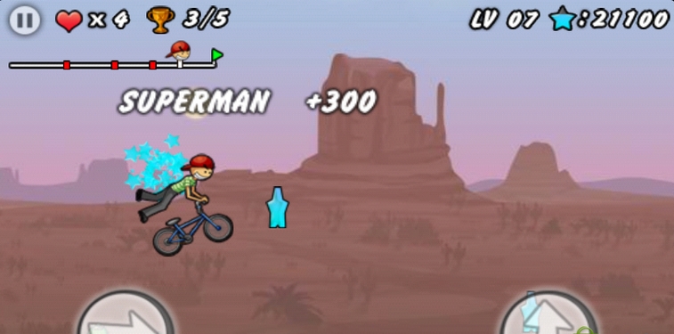 在跑酷少年2安卓版游戏中,玩家需要控制自行车酷男以灵活动作躲过障碍物!吃掉中途出现的辅助宝贝会增加能量!控制单车行进只要按屏幕的提示点击即可实现!游戏途中可以加速度和跳跃!加速越快跳跃越高!动作越炫酷!可爱的农场背景与复杂的山地背景都能给人一种放松的心态!游戏内的难度会随着关卡的加深而加难!使游戏更具挑战性!展现酷男风采!亮出你绚丽的技巧!这就是跑酷少年2的追求,帅呆!酷毙!重重关卡!各种绚丽的技巧!让你体验跑酷少年2的无限乐趣!