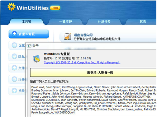 WinUtilities磁盘清理 、注册表清理/备份、自启动程序管理、内存优化、查找重复文件、快捷方式修复、进程管理、卸载管理、系统信息、文件分割/合并、文件清除、可执行文件加密、家长监视控制以及调用Windows系统自带小工具等诸多功能。【使用方法】