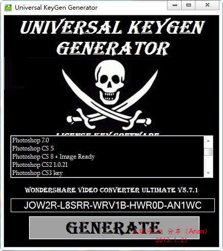 Universal KeyGen Generator 2013是一款功能强大的注册机软件,它可以对WinRAR 4.1、VMware 7、PhotoShop CS5、Office 2010、Office 2011、Windows XP、Windows 7Windows Server 2008、Windows Server 2003 R2等程序或操作系统进行注册。通过该软件注册的程序均为永久激活,免去您再次激活的烦恼,同时也为您省去不少的金钱,有需要的朋友可以下载使用!