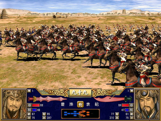 相信接触过4的玩家都会体会到这一点。4代的武将一出场就是与众不同,举手投足都充满了气势和力量,那怕他坐下的只是一匹普通的黄鬃马。群4彻底改变了3代以前那种木偶般的僵硬画面,武器珠光宝气,烁烁生辉。武将跑起来颇含动感,吕布金冠上的饰条随风摆动,威风凛凛。赵云改变了群3金盔金甲的争议装扮,恢复了原有白马银枪。