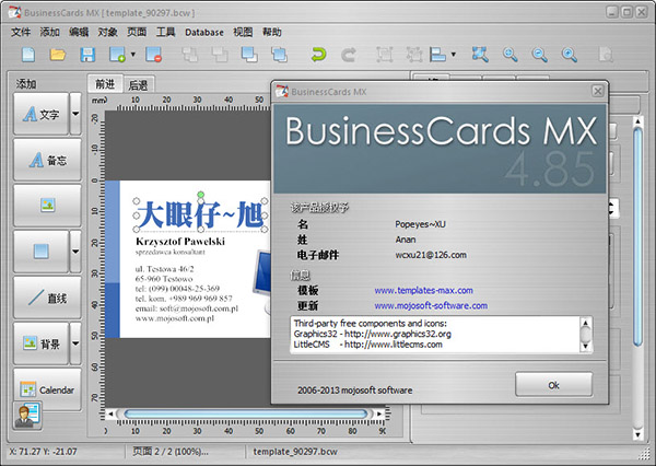 BusinessCards MX一款商业名片制作软件,能帮助你设计和打印专业的名片,软件界面经过特别设计,初学者也不会遇到任何问题。软件中包含了上百种常用的名片模板。