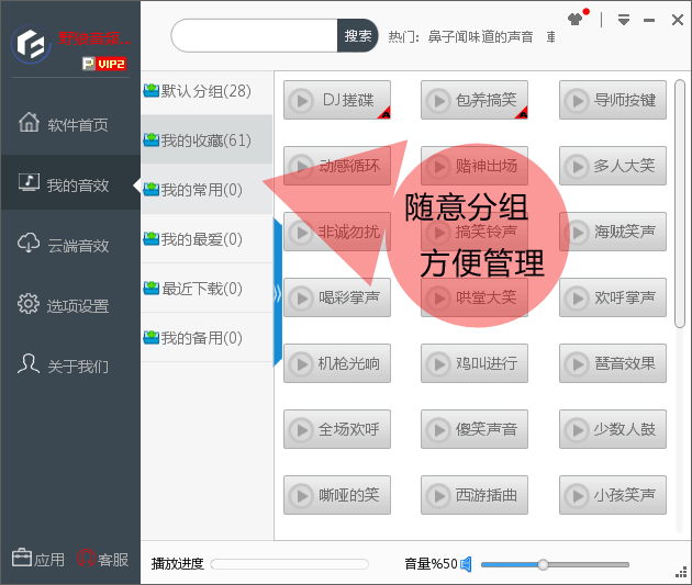 1、本软件内置主持类、喊麦类、动物类、乐器类、自然类等10个分组,共计120个单音音效