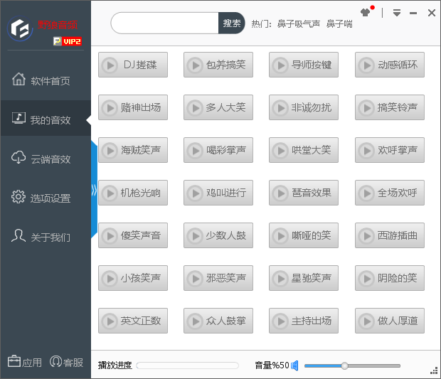 野狼F8音效王是由野狼音效网推出的集语音聊天、网页主播、电脑K歌功能为一体的音效软件,内置群众笑声,尖叫声,掌声,婴儿笑声,狗叫声,打呼噜,打喷嚏,乌鸦飞锣鼓敲响,军鼓滚奏等几十种主持音效,页面简洁,操作简单。是一款主持必备的神器。