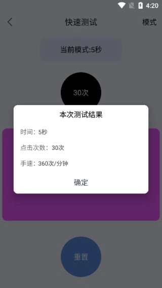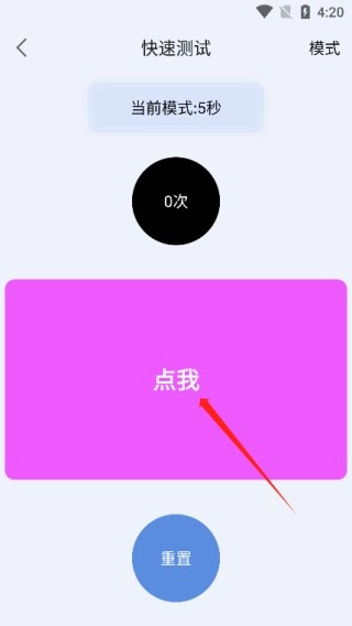 2. 就拿快速点击来说,进入页面后,右上角会出现“模式”选项,通过该选项能够对点击测试时间进行修改。