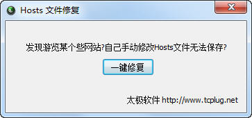 太极hosts文件修复工具可将被恶意程度锁定或修改的hosts文件恢复到系统默认文件,打开后,点击修复,如有杀毒拦截请允许就可以了。