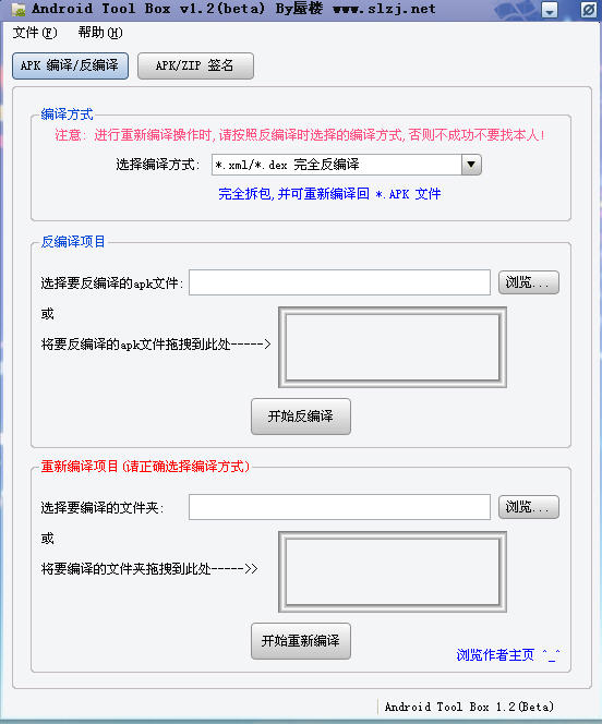 安卓工具箱 Android Tool Box是一款支持多种方式 反编译/重新编译 安卓 *.dex/*.xml 文件、批量签名安卓 apk/zip 文件的android小工具!