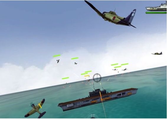 第3关: 同样是比较简单的一关。胜利条件:保护己方船舰,消灭所有敌机。失败条件:己方船舰被毁(屏幕右上角血量格为0),本机被炸本关共有3轮敌机共16架。开始后越过己方船舰直飞(撞船飞机会炸)。渐渐能看见敌机了~~不少啊第1轮8架!准备战斗!从左往右逐个扫射,第2轮和第3轮都是4架一群的很容易解决,数个来回消灭所有敌机过关。