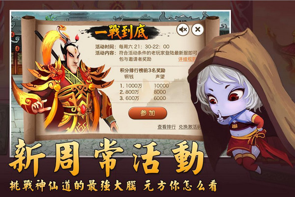 【为资源而战】击杀boss,人人有奖!你和你的小伙伴都准备好了吗?仙友们,赶紧冲!【为荣誉而战】问世间,是否此山最高?世界boss伤害排名告诉你谁才是为全服而战的大英雄。想成为万众瞩目的全服偶像吗?展示出你最强的实力吧!