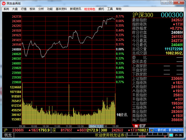 民生证券钱龙金典版支持最新的交易规范,支持港股行情下载,具有智能报表、全功能条件编辑、迭加分析、动态警示、数据导出等功能,而且金典版更加注重数据和分析手段的全面性,是顶级的证券投资分析专业工具。民生证券金典版能够提供十五大功能模块,包括大盘分析、报价分析、个股即时分析、技术分析、多股同列、特别报道、公告信息、基本资料分析、系统工具、港澳资讯专栏、券商信息、财经直播室、实时委托、钱龙信息中心和退出系统,全方位多方面为用户提供一个理想的投资平台,让用户购买的股票一路飘红,赢在起跑线。