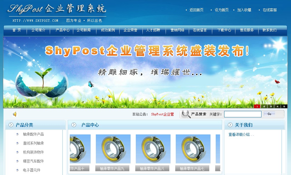 ShyPost企业管理系统是一套基于ASP的智能建站软件!ShyPost企业网站管理系统具有界面新颖美观、动感时尚等特点,是一套服务于中小企业的CMS内容管理系统,软件使用门槛低,无须专业电脑知识,全后台操作管理,操作简单且功能强大,同时软件还具有极强的可扩展性,可以适应各行业不同的需求。