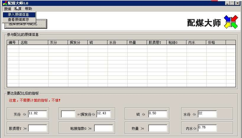 大师电脑配煤软件v1.23更新:1.增加控制精煤灰熔点指标的上下限的功能