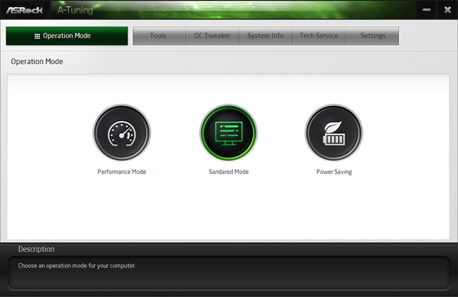 A-Tuning默认主界面是Operation Mode,一键切换性能模式、标准模式和节能模式。