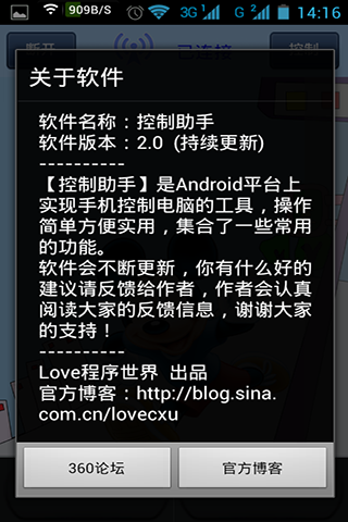 控制助手是Android(安卓)平台上实现手机控制电脑的工具,操作简单实用方便,集合了一些常用的功能,通过控制助手你就可以实现手机控制电脑、有了它你可以控制自己的电脑关机、待机、重启、锁定电脑屏幕、锁定鼠标键盘、关闭显示器、传送文字、控制电脑鼠标、运行CMD命令、等操作。