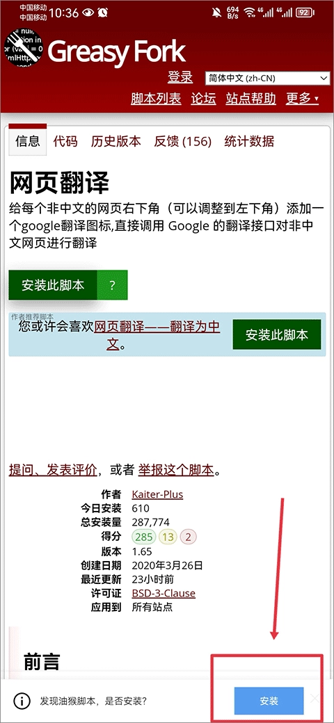 1、以网页翻译这个脚本来说,打开脚本详情页面后,直接点击“安装此脚本”按钮。