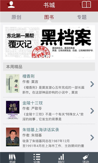 凤凰读书客户端接入读书频道多年积累的高品质出版图书资源,涵盖了文学、社科、历史、军事等优质内容;原创频道旗下众多优秀作者发表的独家热门小说、文学作品也可直接阅读;更汇聚了国内最新最热的网络小说。并且,大部分内容对用户免费。