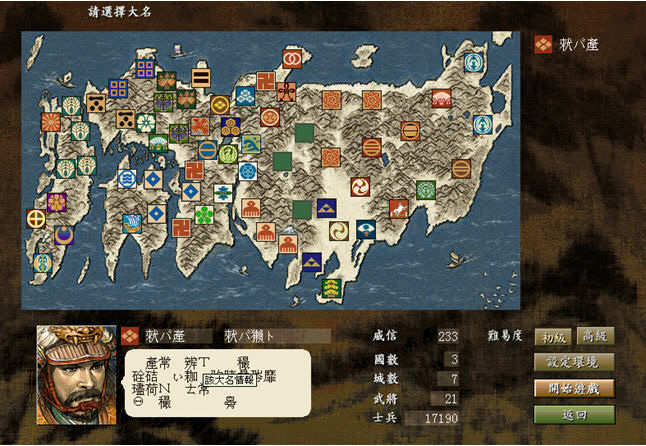 信长之野望8游戏一开始的片头动画与音乐本着“光荣公司”的一贯水准、相当震烁人心!可惜总透着该公司其他游戏中的一些影子而似乎缺乏了那麽一点新意。游戏中运用古日本的分国法将全日本分国(类似三国志里面的州郡),每一个国再划分为许多城池,这些城池与山岳、河川、乡镇、田野、等精致图素组成了充满古风的日本战略地图,,整个战略地图画面与前作《将星录》非常相似,颇为真实的模拟出当时的时空环境,当你使用滑鼠指到某些地点上面,讯息还会告诉你这是什麽地形甚至是那一座名胜古迹唷!可惜这种分国法因为凡事都必须先找到城池所属的国才能选择该国所属的城池,在整个游戏操控方面反而较《将星录》繁琐许多。