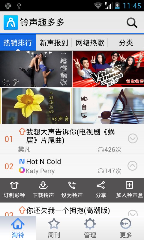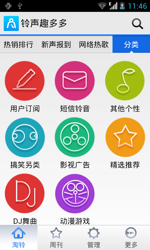 【天天有新铃】紧贴潮流,收纳时下最热、最新的歌曲铃声,还有搞笑、影视、DJ、动漫、短信铃声,乐趣无限!【极速试听】强大的云服务,带来极速的试听体验!不仅是Wifi,在2.5G/3G网络下一样流畅!