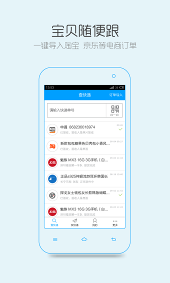 快递查询:输入快递单号或扫描条形码即可查询快件跟踪及签收状态,支持国内数十家快递品牌如:申通、EMS、顺丰、圆通、中通、韵达、天天、汇通、宅急送等;