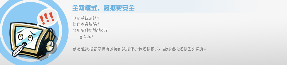 信易通数据管家是一款非常好用的数据恢复软件,信易通数据管家拥有独特的数据保护和还原模式,能够轻松还原丢失数据。在软件本身错误或系统崩溃等极端情况下也不会导致用户数据丢失。