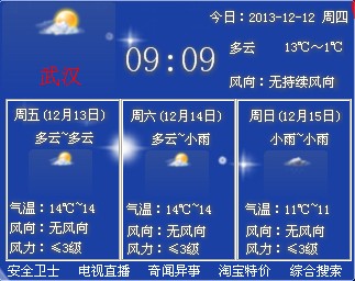 1.显示时间日期及四天的天气状况,如晴朗或多云、风向指标、温差等信息
