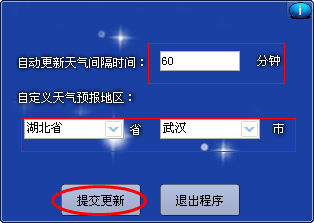 2.设定自动更新时间及其地域,然后提交更新即可。如60分钟、湖北、武汉