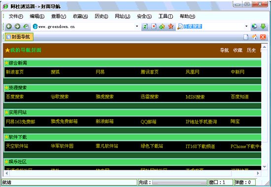 阿杜浏览器是一个体积小,极其方便浏览器的基于IE内核的多窗口、多用户、个性化浏览器.智能封杀广告条,并大大加了快访问速度,在同类技术中处领先水平;以常用网址作为启动页,另设快捷站点,完全解决IE主页容易被修改的问题; 浏览器捆绑网络书签服务,配合上网记录清除功能,非常适合于多用户场合使用;程序界面与IE相似,使用操作极其简单;具有模糊智能填表功能,消除了上网由于填表所带来的烦恼;支持RSS阅读;是一个非常优秀的新兴的浏览器。最新版本的AdoIE还具有组图制作功能,并自动生成UBB代码,对图片和论坛贴图爱好者来说AdoIE是最佳选择!本程序可以右键解压后使用!