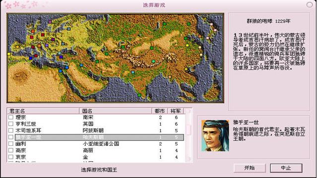 游戏目的:玩家选取大地图上的任何一个国家,透过发展内政、外交及进行征服,消灭其余所有的势力,统一亚洲、非洲及欧洲。