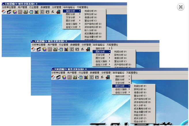 系统基于成熟的财务分析理论,以财务报表数据为基础,运用多指标、动态的分析方法,环环相扣,使企业全方位、多角度的了解自身的经营财务状况。基于财务报表数据,正确的分析结论只有一个,那就是能够准确、客观的反映企业的经营管理状况。