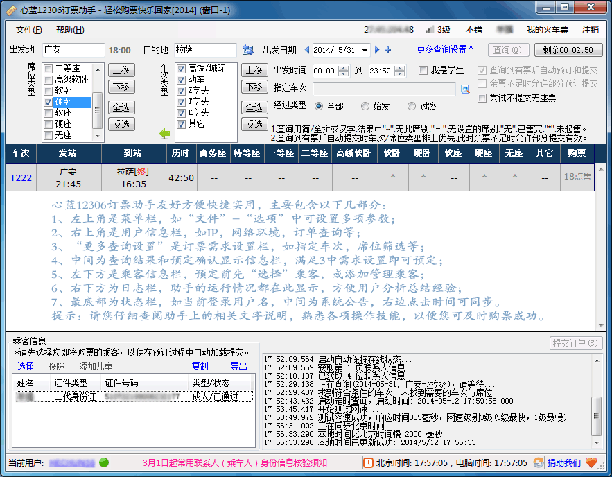1、本助手不会存储任何个人身份信息,用户名密码等都是直接提交给12306官网,请大家自己保护好信息;2、为提高购票效率,希望大家仔细看界面说明及帮助,并在购票时将电脑右下脚可退出的程序都退出;