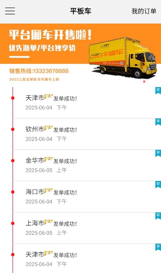 2. 点击进入平台车页面,就能查看不同城市下单成功的记录,这些记录涵盖时间与发车地信息,便于用户实时了解订单动态。